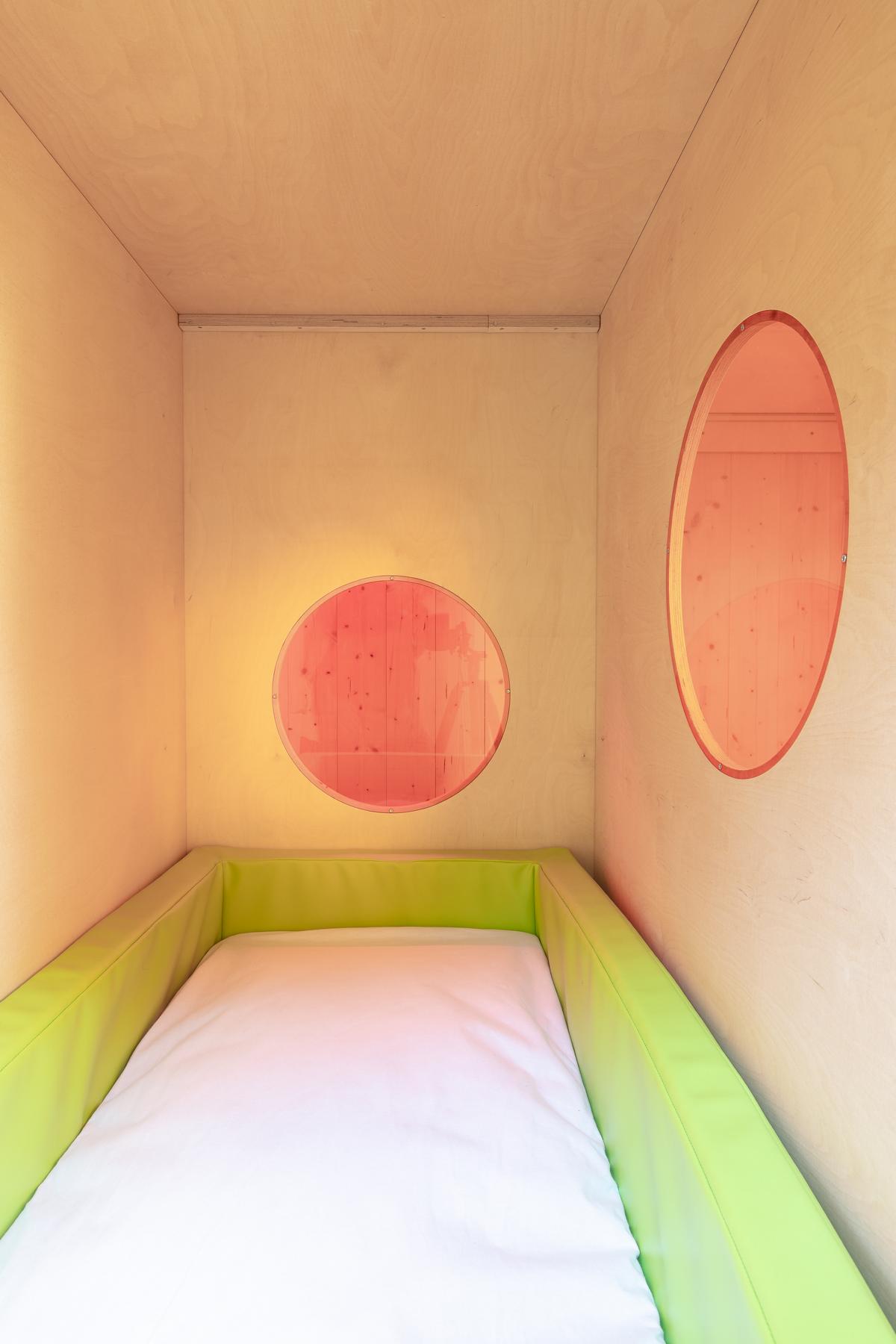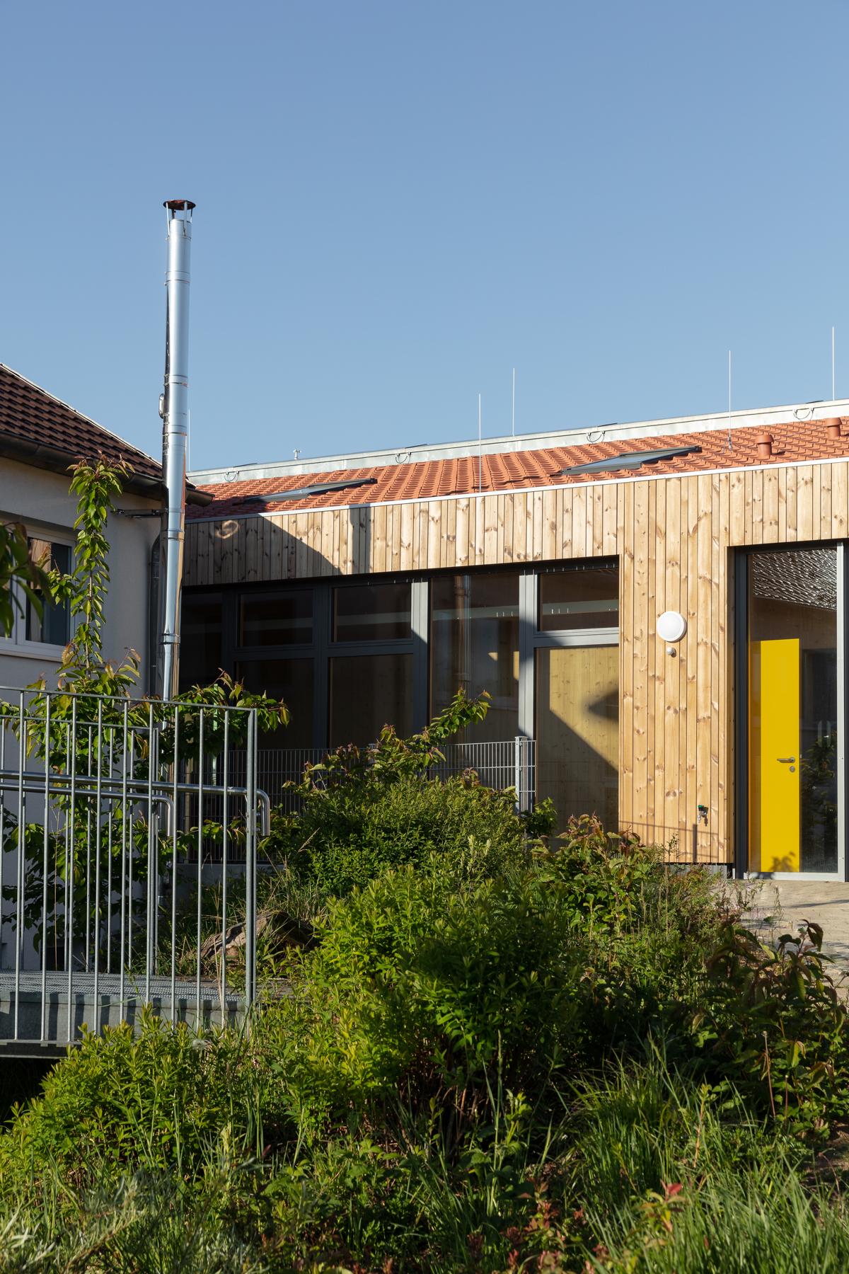 Ein barrierefreier, eingeschossiger Bau in Hybridbauweise (Stahlbeton und Holz) mit 1 Kinderkrippe sowie einem Personalraum mit Archiv im Nordwestlichen Bereich des Bestandsgebäudes.