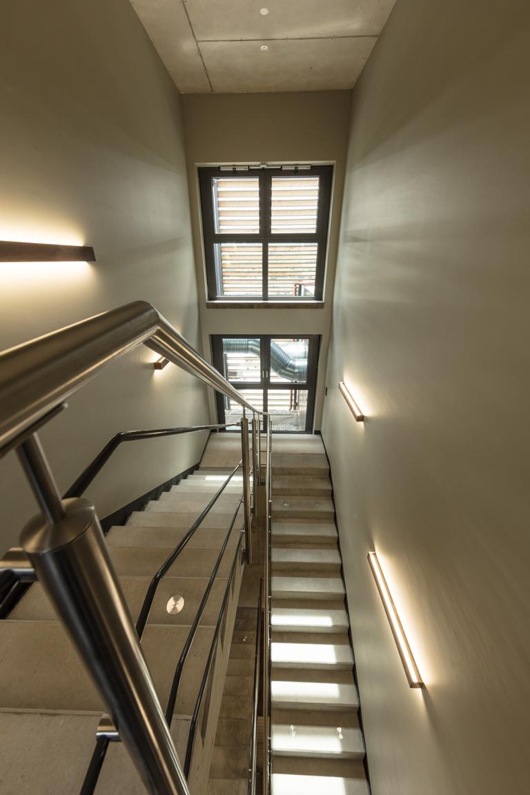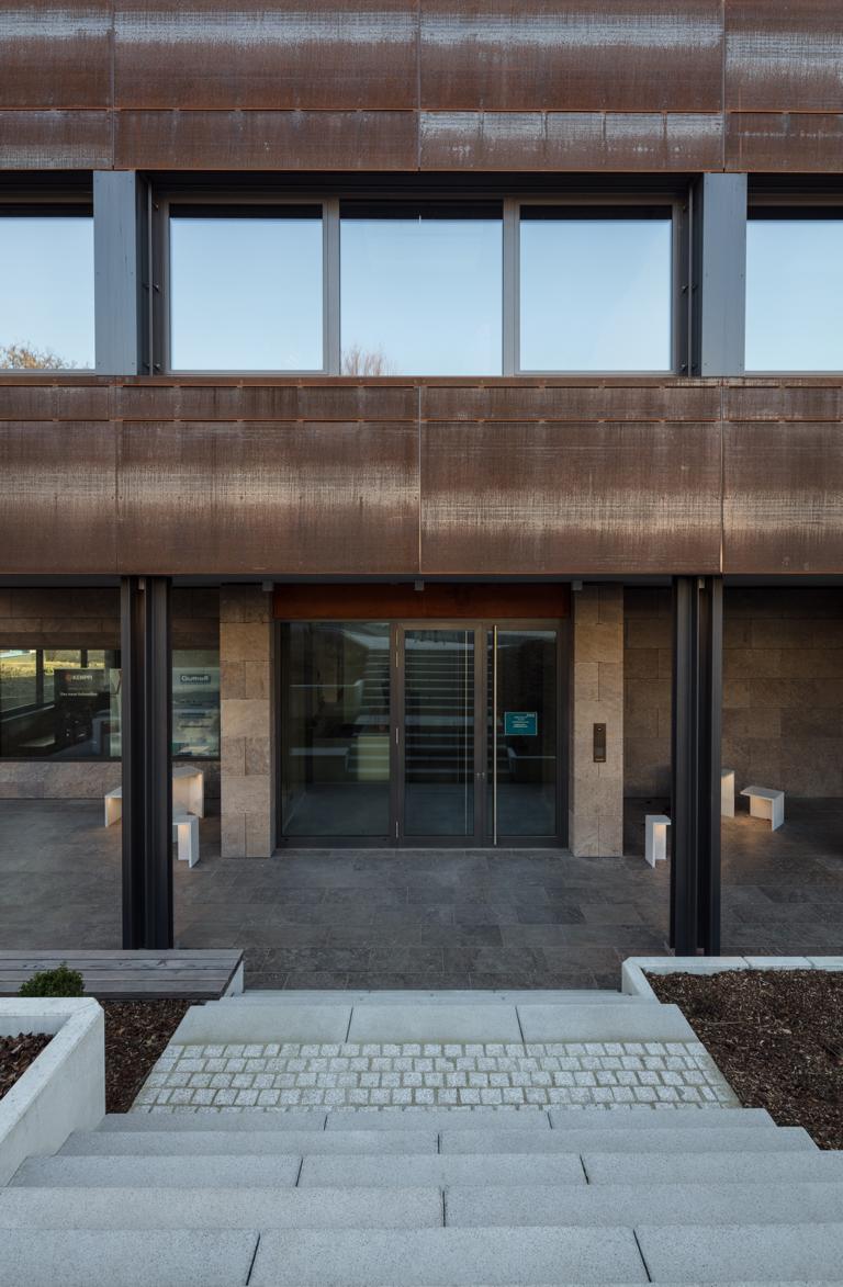 Die Architektur des Technologiezentrums steht ganz unter dem Einfluss von „form follows function“. Es handelt sich um einen verfeinerten Gewerbebau mit einem ausgeklügelten Farbkonzept und metamorpher Fassadenbekleidung, welche aus wetterfestem Stahl besteht.