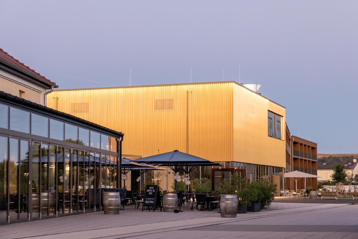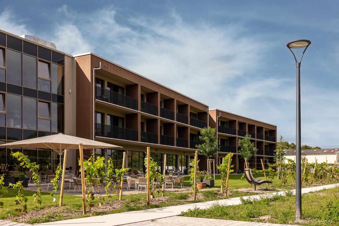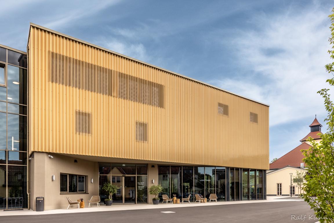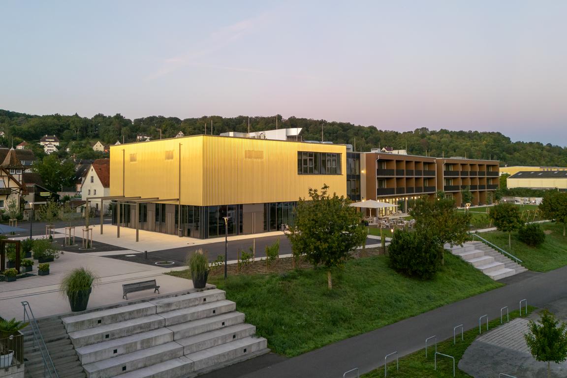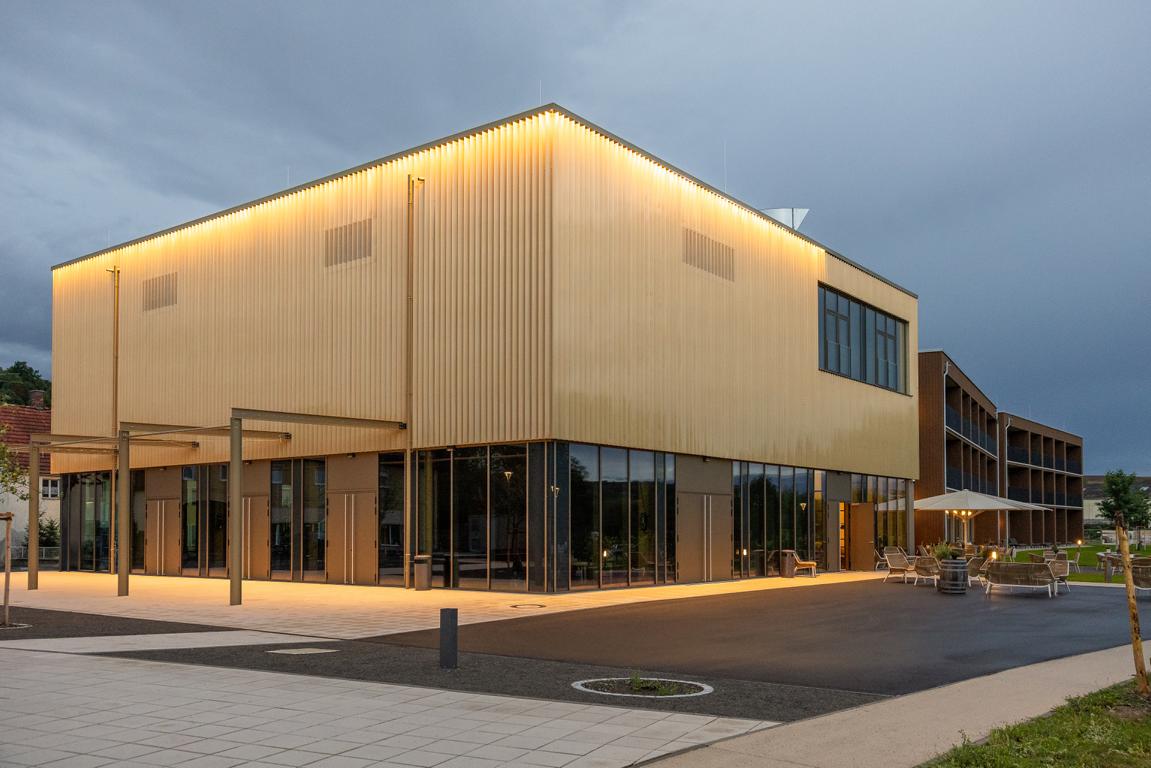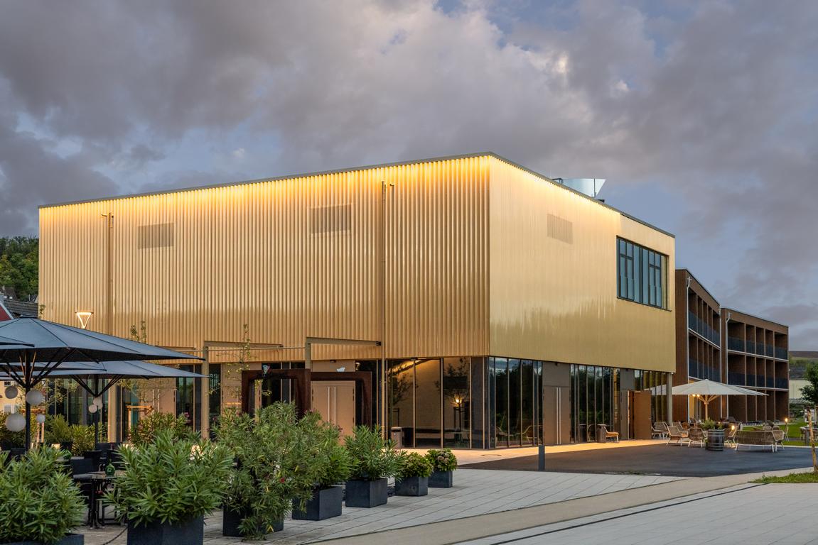 Angrenzend in Richtung Westen gliedert sich nach einem Platz eine multifunktionale Veranstaltungshalle in Holzbauweise und ein dreigeschossiges Hotel mit Weinbar, sowie Fitness- und Wellnessbereich an. Das Angebot komplettieren dort flexibel nutzbare Tagungsräume (Hotel Meintz).