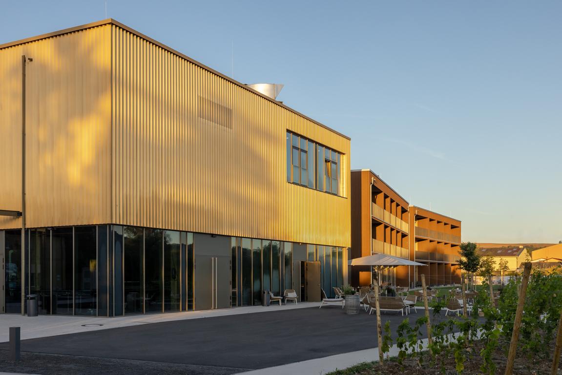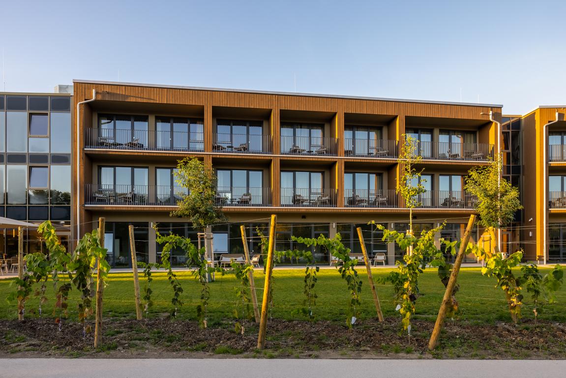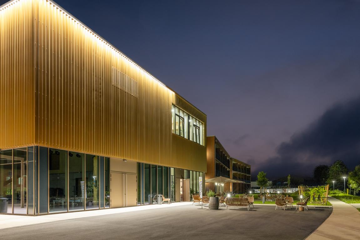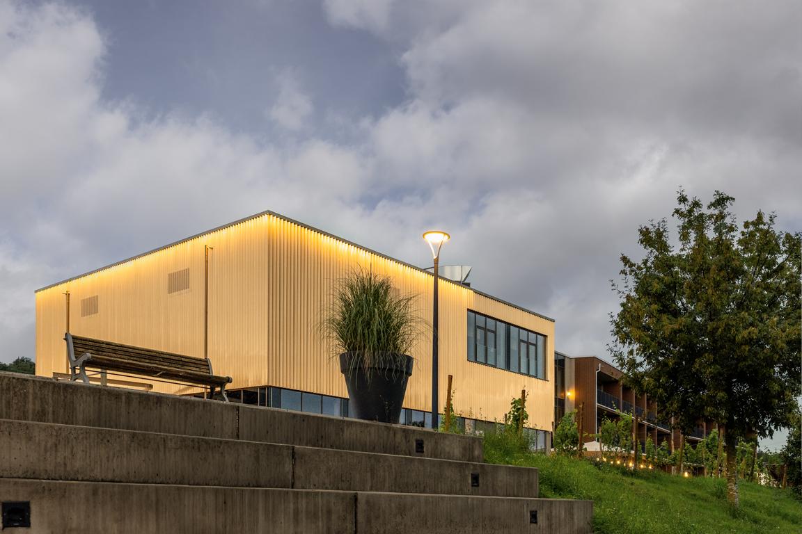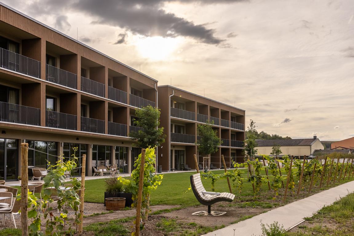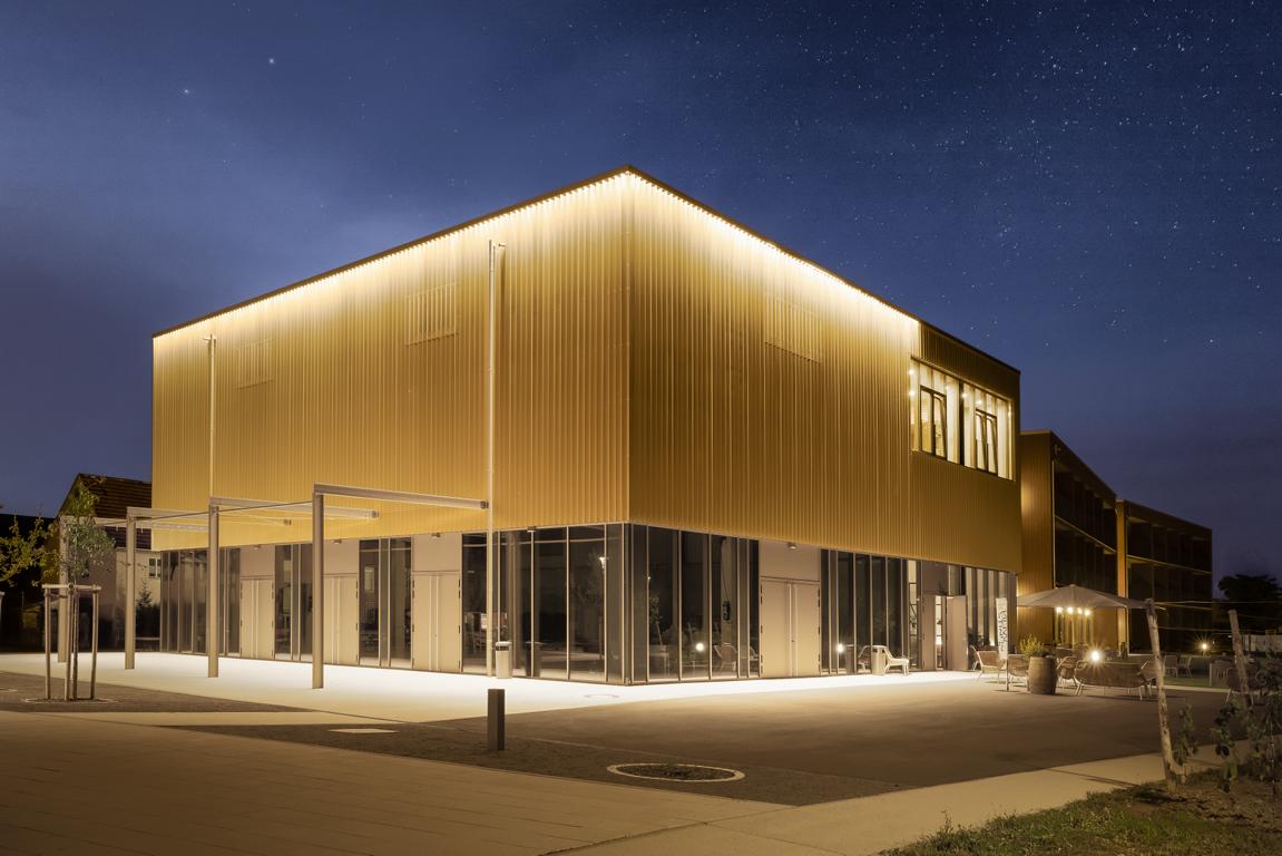Angrenzend in Richtung Westen gliedert sich nach einem Platz eine multifunktionale Veranstaltungshalle in Holzbauweise und ein dreigeschossiges Hotel mit Weinbar, sowie Fitness- und Wellnessbereich an. Das Angebot komplettieren dort flexibel nutzbare Tagungsräume (Hotel Meintz).