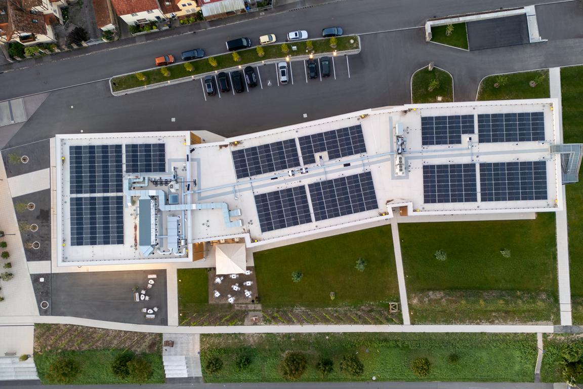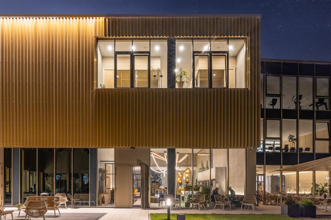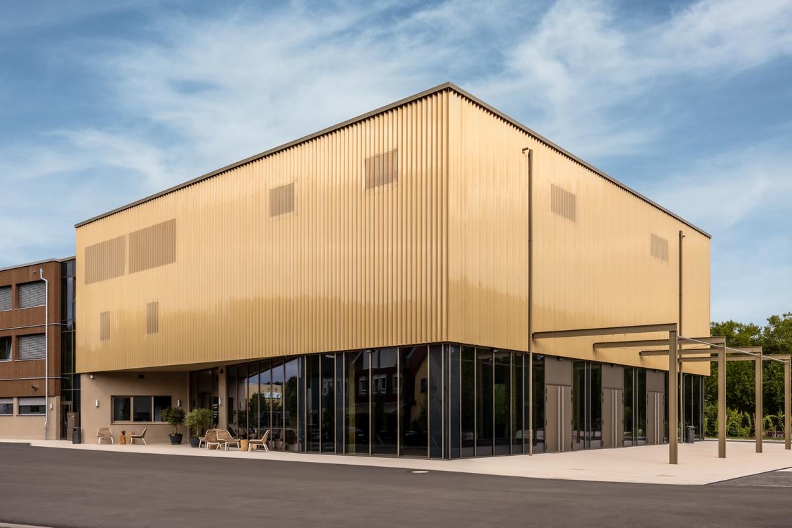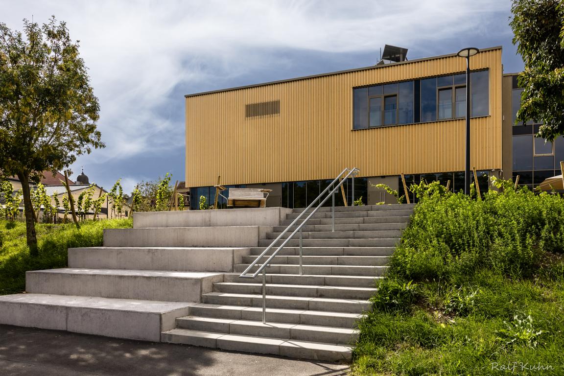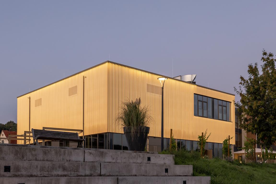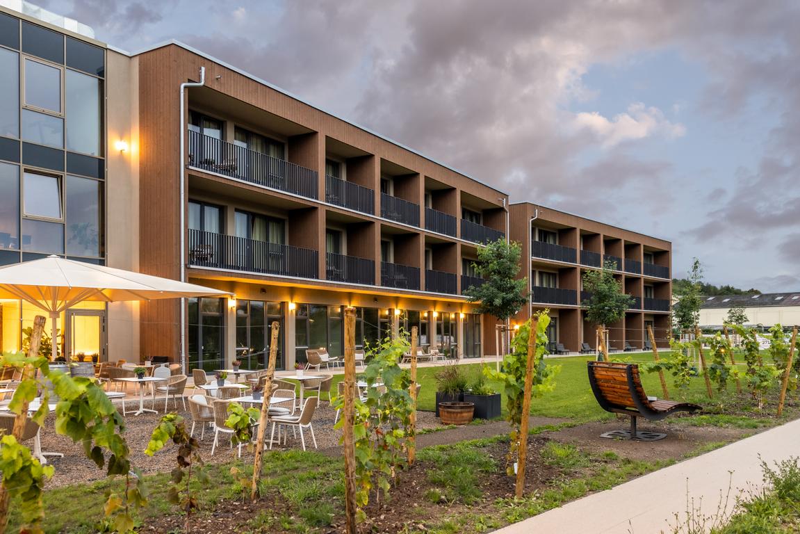 Angrenzend in Richtung Westen gliedert sich nach einem Platz eine multifunktionale Veranstaltungshalle in Holzbauweise und ein dreigeschossiges Hotel mit Weinbar, sowie Fitness- und Wellnessbereich an. Das Angebot komplettieren dort flexibel nutzbare Tagungsräume (Hotel Meintz).