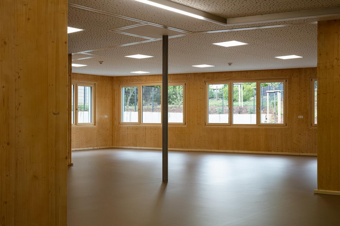 Barrierefreier, eingeschossiger, modularer Bau in Massivholzbauweise mit 3 Kindergrippen und 2 Kindergartengruppen. Jedes Modul besitzt einen separaten Sanitärbereich, um eine maximal flexible Nutzung zu gewährleisten.